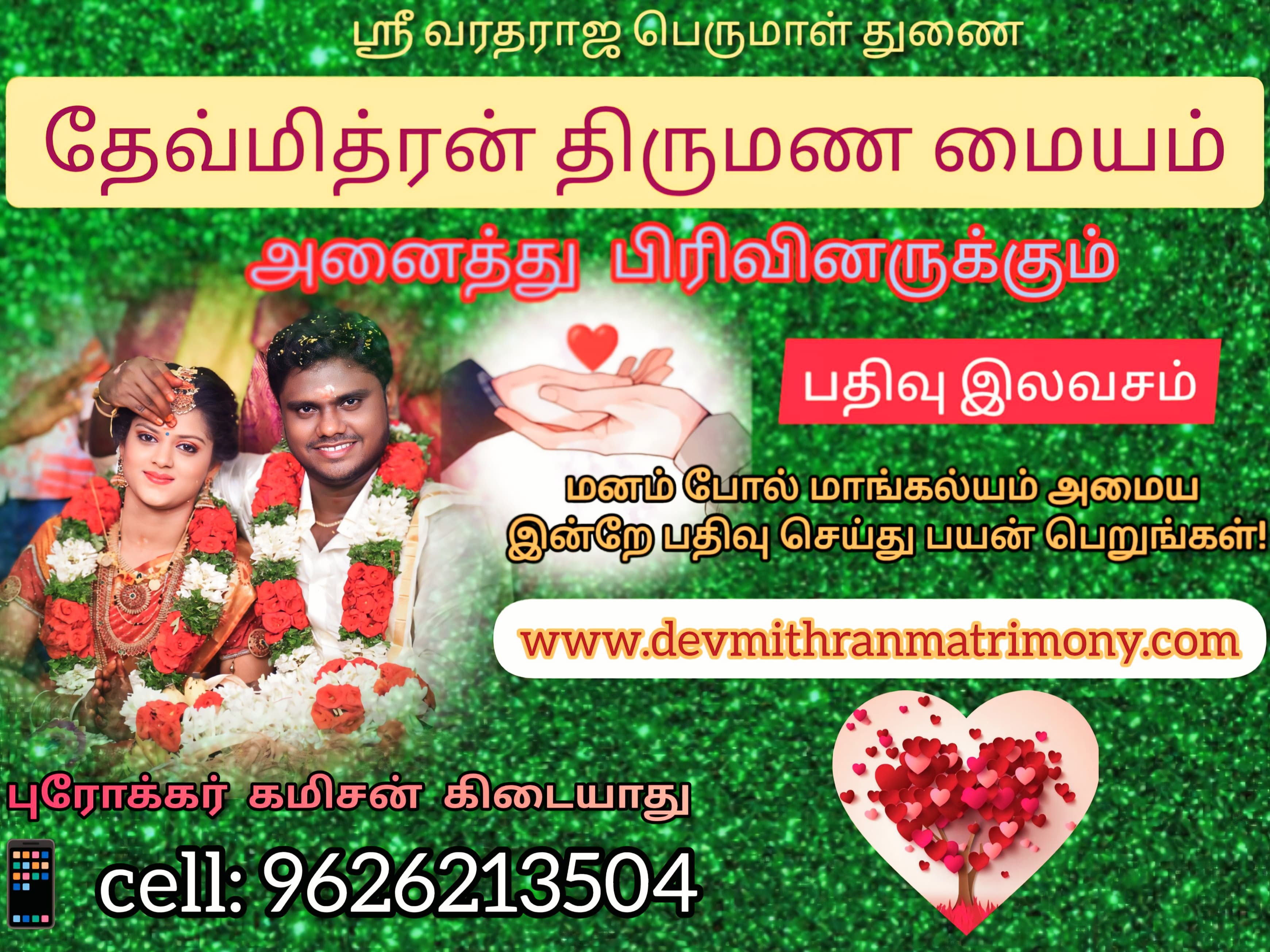 உங்களுக்கு ஏற்ற வரன்கள் கிடைக்க இப்பொழுதே கீழ்கண்ட தொலைபேசி எண்ணிற்கு விபரங்களை அனுப்பி பதிவு செய்து கொள்ளுங்கள்